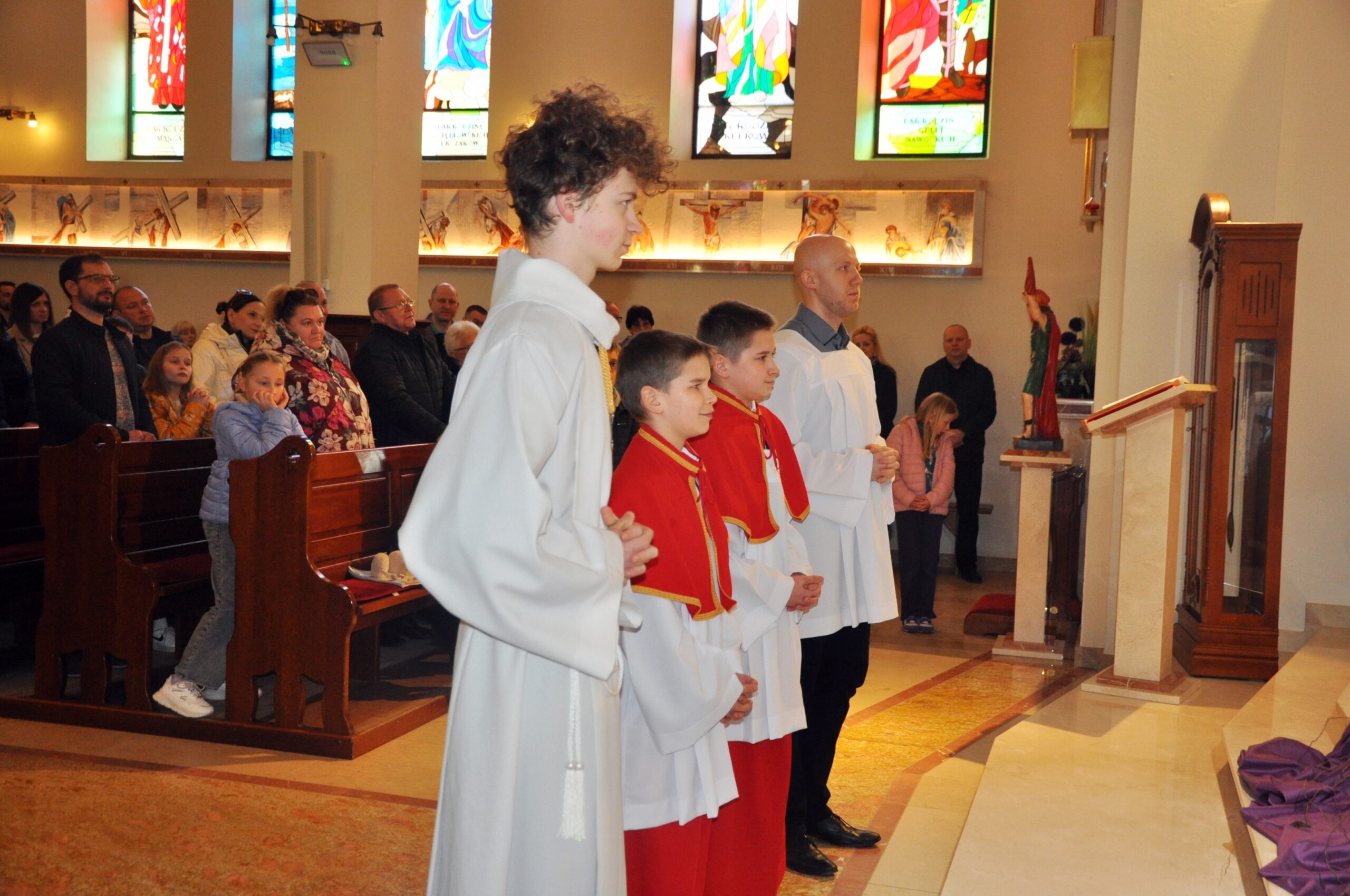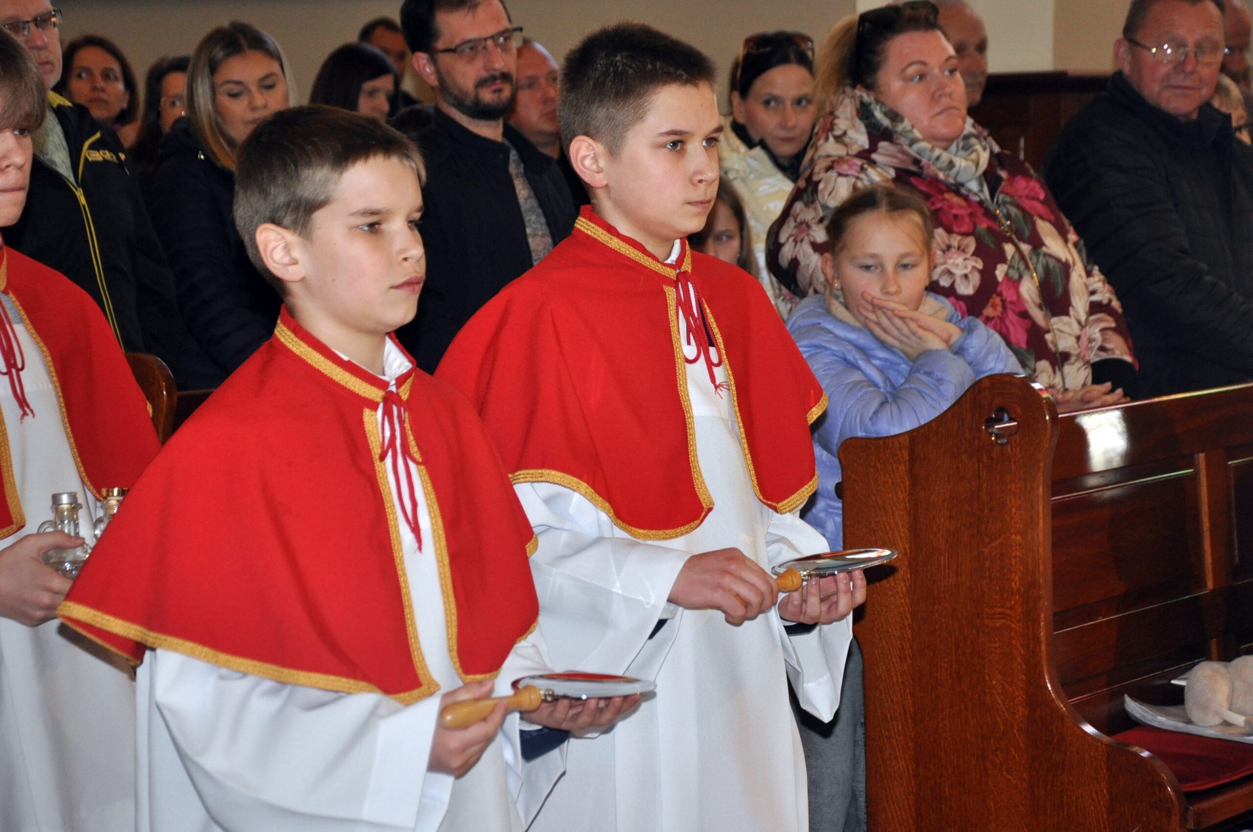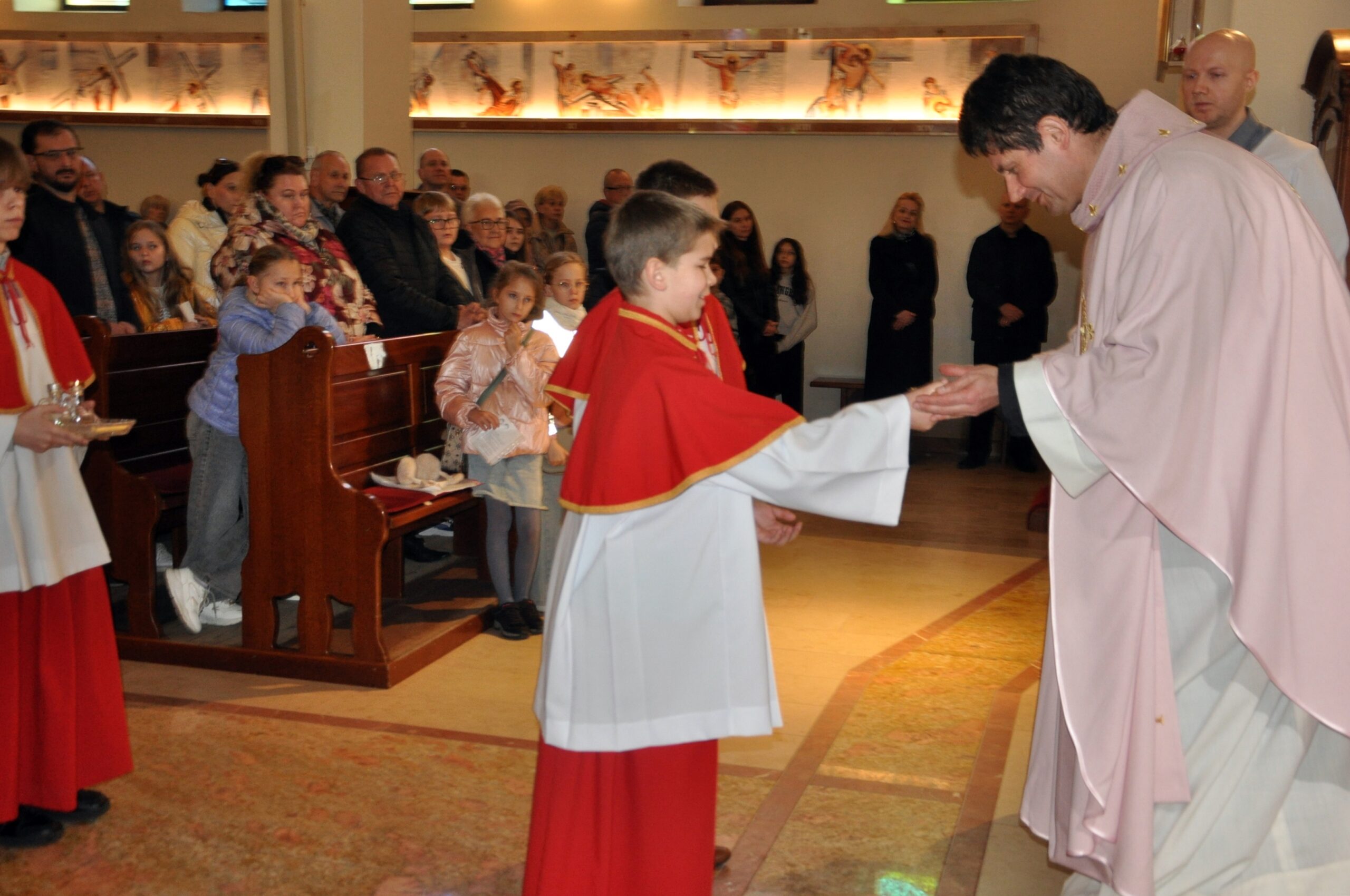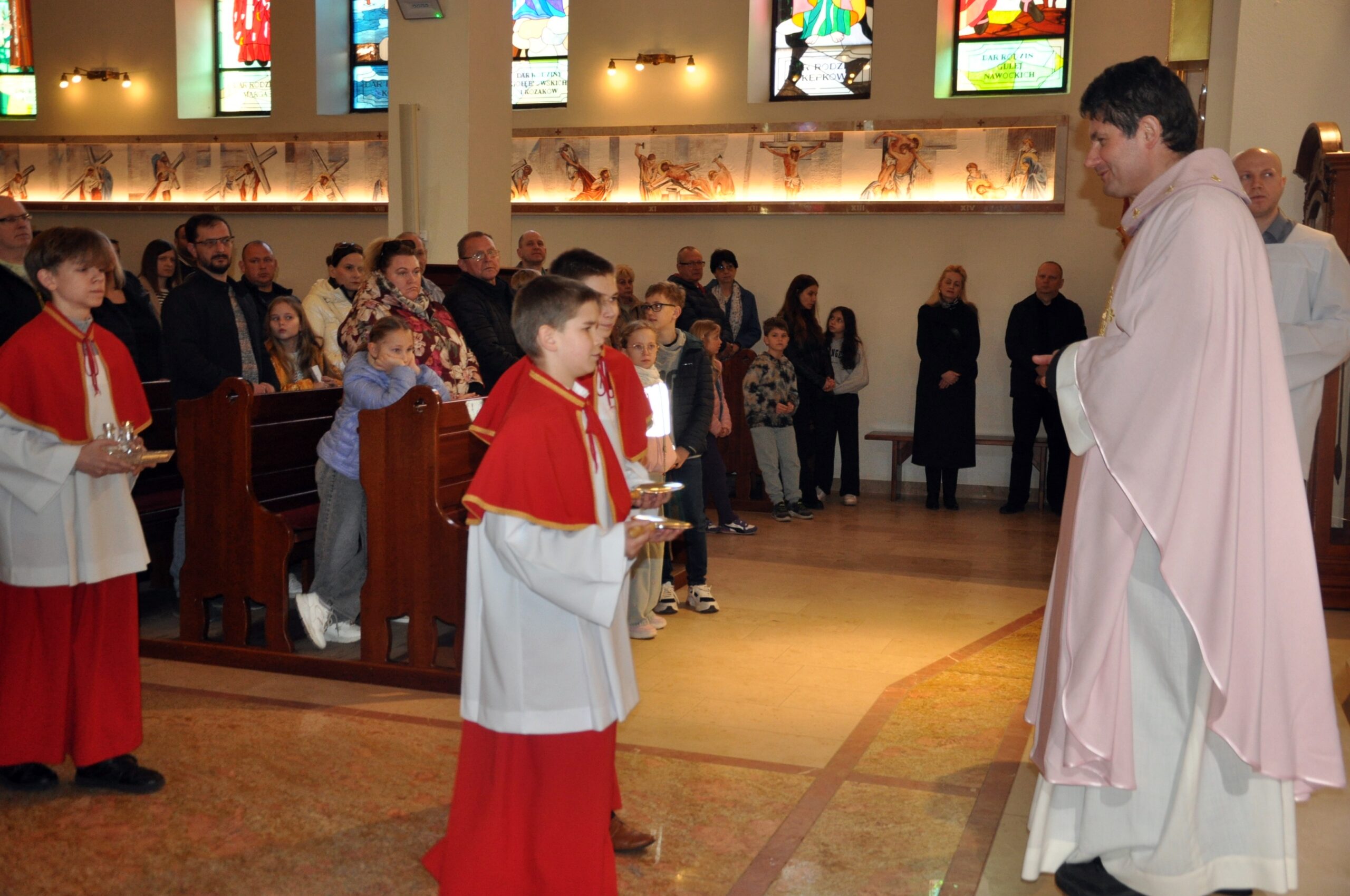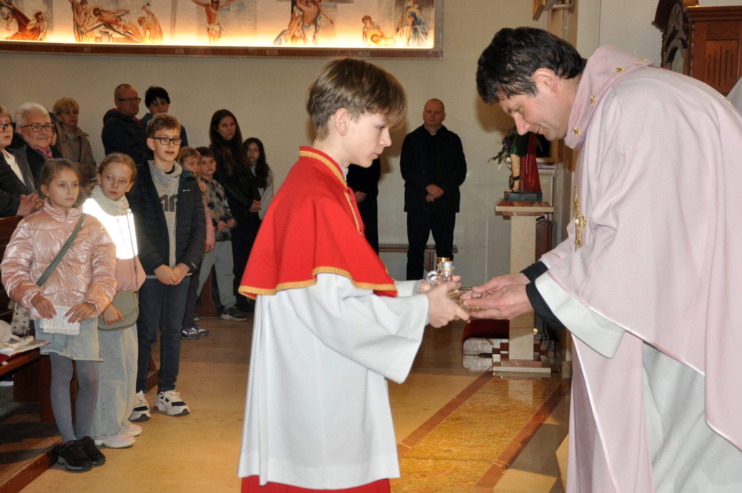 Również 15 marca 2026 roku, w Niedzielę Laetare, z wielką radością nasza wspólnota parafialna powitała w gronie Służby Liturgicznej Ołtarza dwóch nowych ministrantów. Obrzęd przyjęcia miał miejsce podczas Mszy Świętej o godz. 11:30 i dokonał go Ks. Proboszcz. Nowi ministranci, Jakub i Krzysztof, przygotowanie do posługi ministranta rozpoczęli się z nowym rokiem szkolnym 2025/2026. Dziś ich zapał został zwieńczony symbolicznym nałożeniem komży wraz z pelerynką. Rodzice nowym ministrantów ufundowali dla naszej wspólnoty parafialnej dwie nowe pateny ministranckie. Z serca dziękujemy za ten dar ołtarza!
