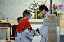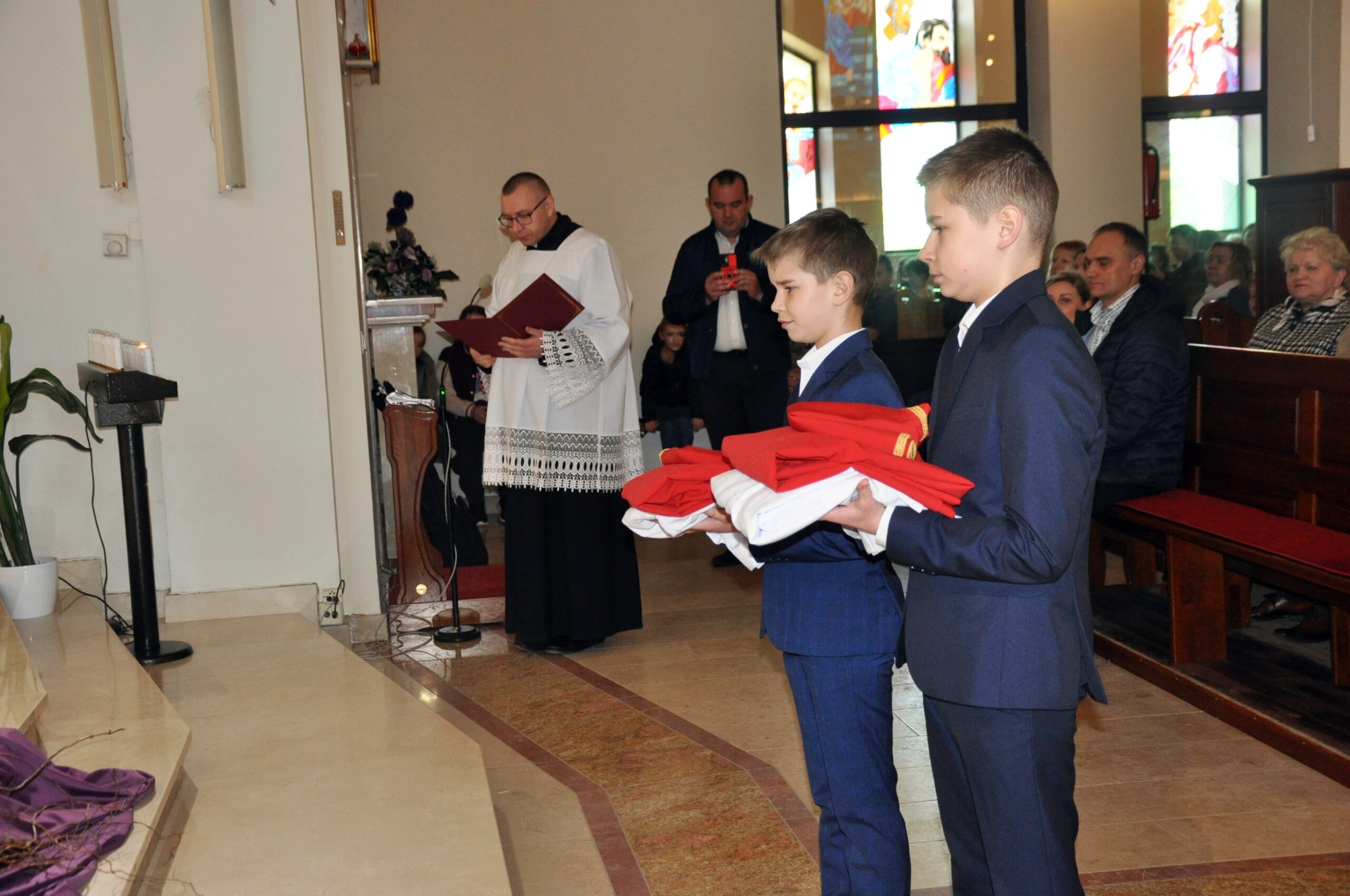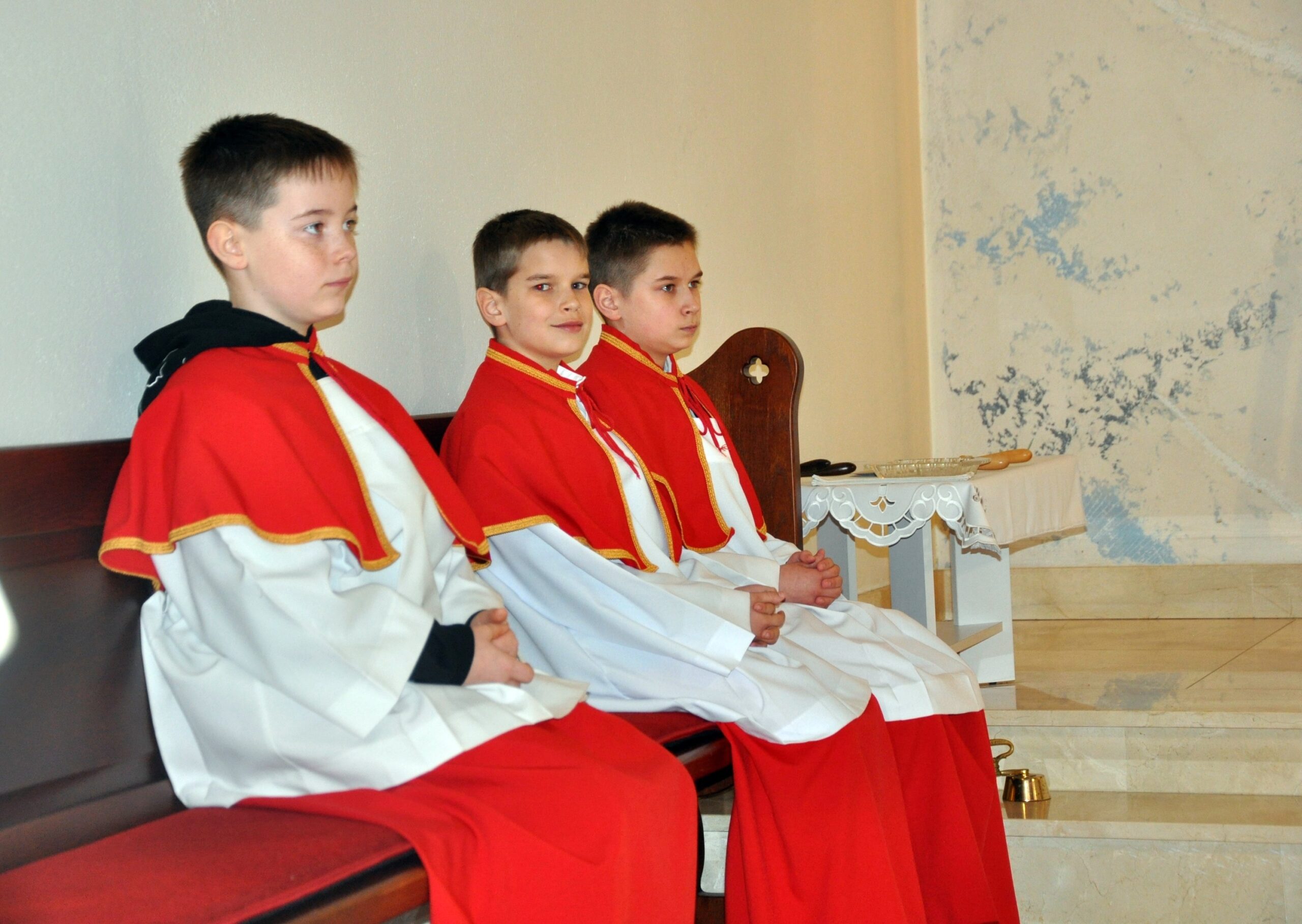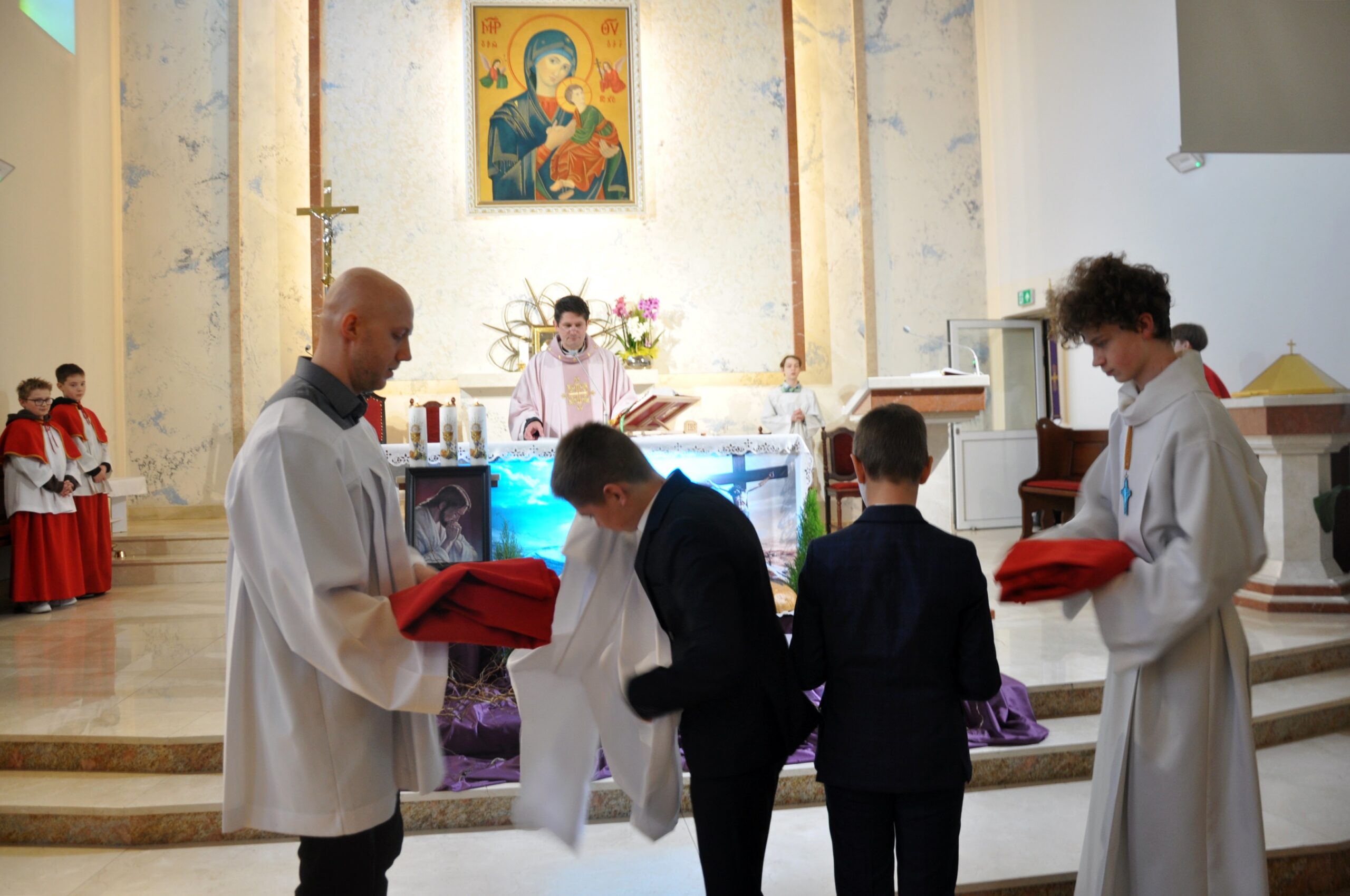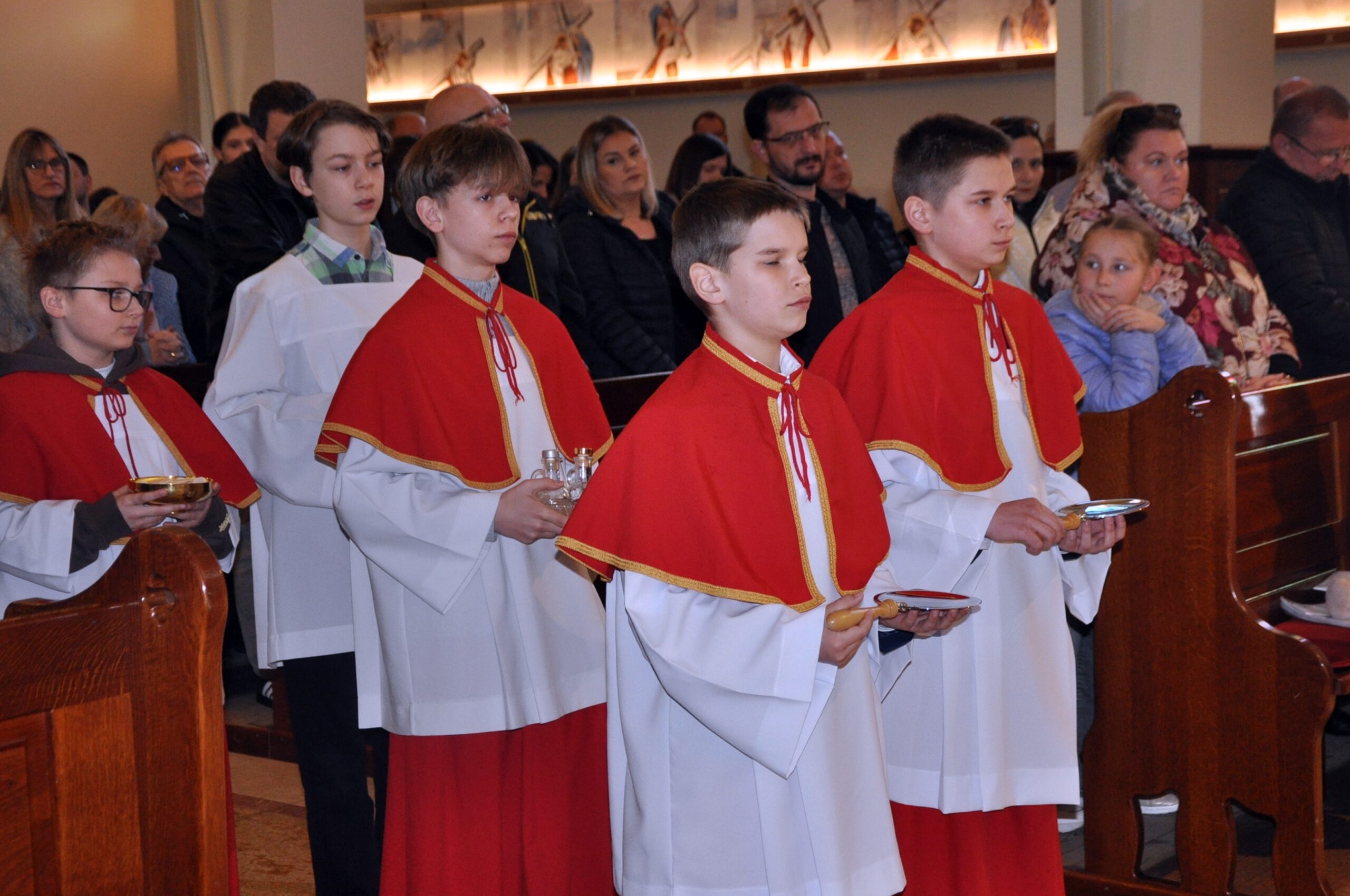 Również 15 marca 2026 roku, w Niedzielę Laetare, z wielką radością nasza wspólnota parafialna powitała w gronie Służby Liturgicznej Ołtarza dwóch nowych ministrantów. Obrzęd przyjęcia miał miejsce podczas Mszy Świętej o godz. 11:30 i dokonał go Ks. Proboszcz. Nowi ministranci, Jakub i Krzysztof, przygotowanie do posługi ministranta rozpoczęli się z nowym rokiem szkolnym 2025/2026. Dziś ich zapał został zwieńczony symbolicznym nałożeniem komży wraz z pelerynką. Rodzice nowym ministrantów ufundowali dla naszej wspólnoty parafialnej dwie nowe pateny ministranckie. Z serca dziękujemy za ten dar ołtarza!