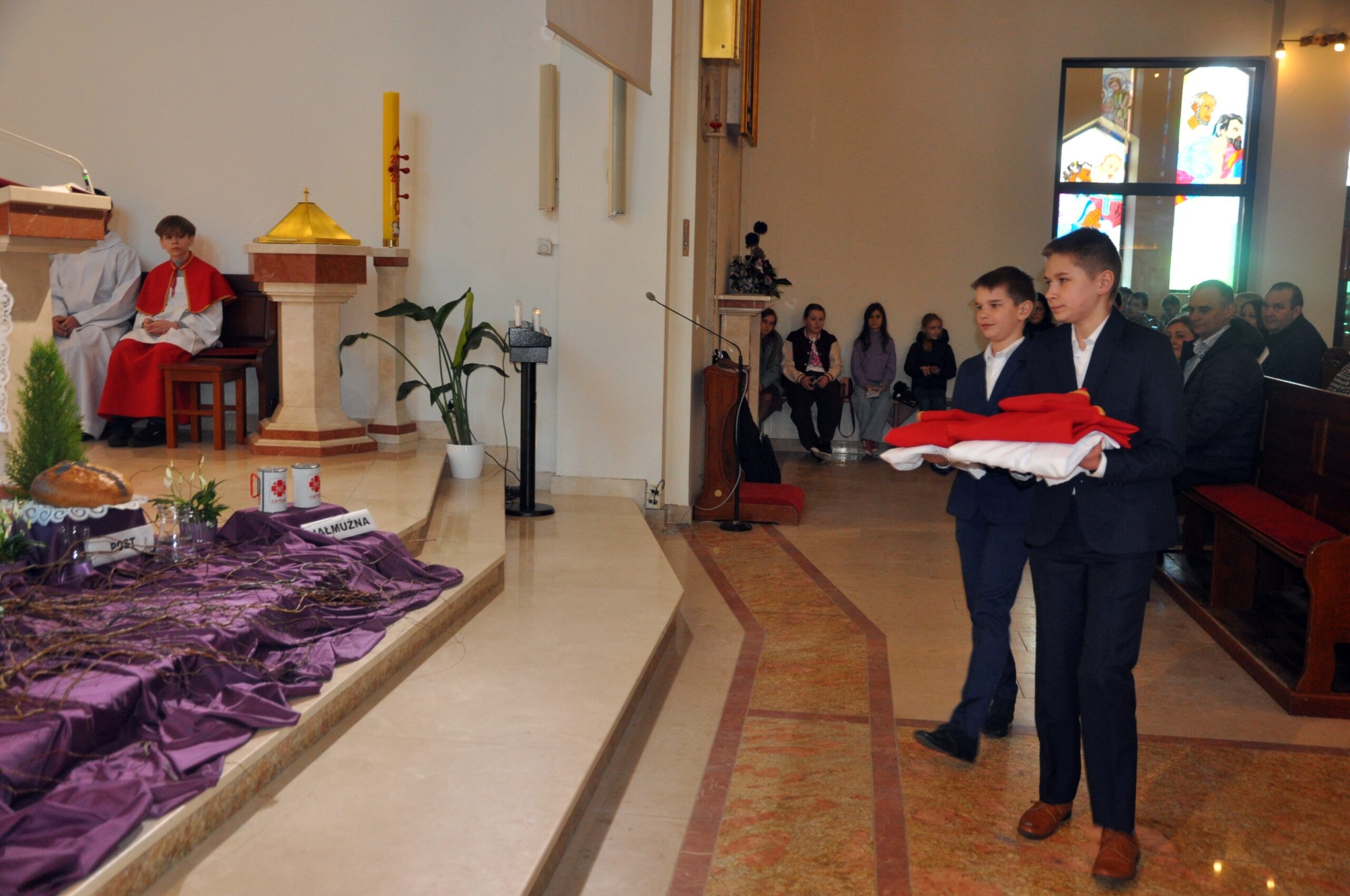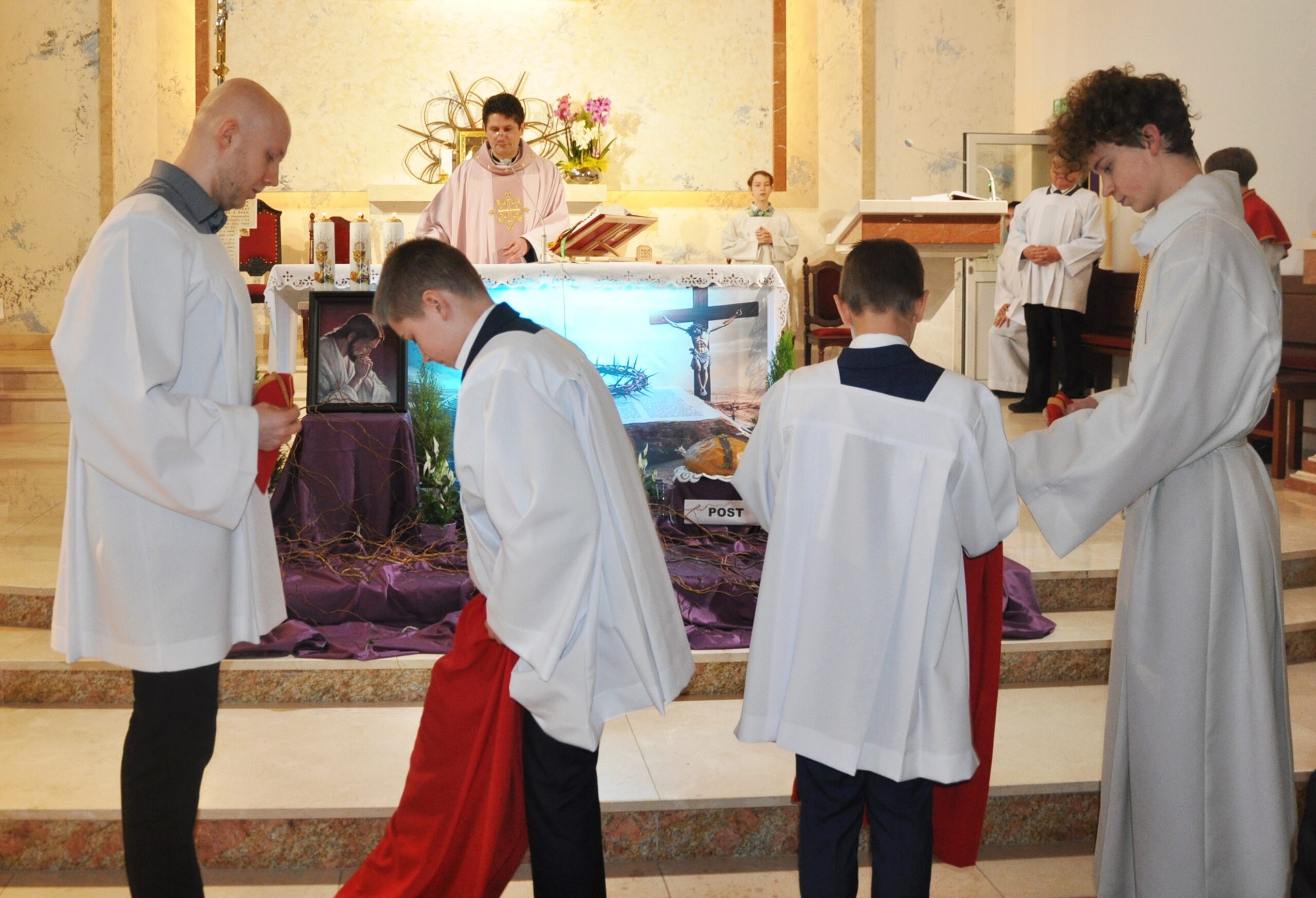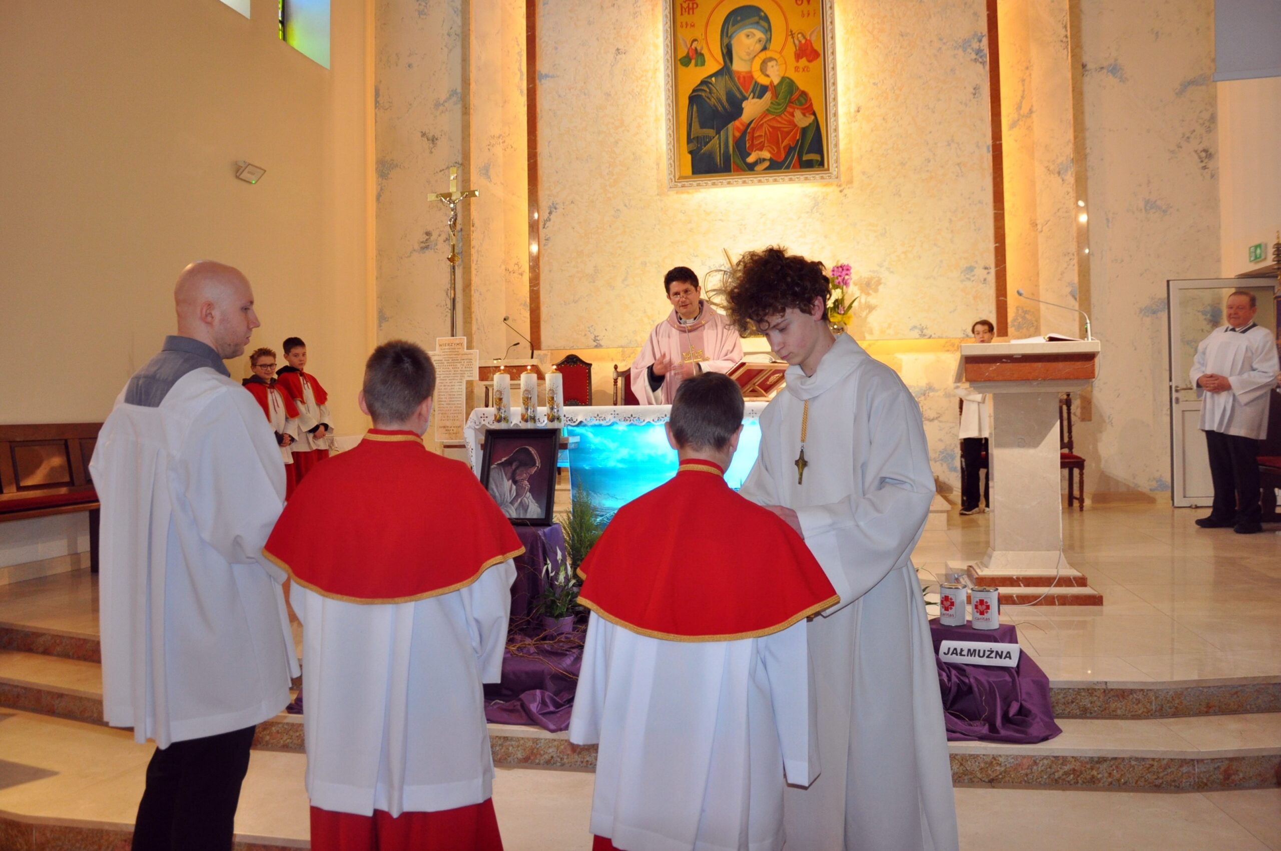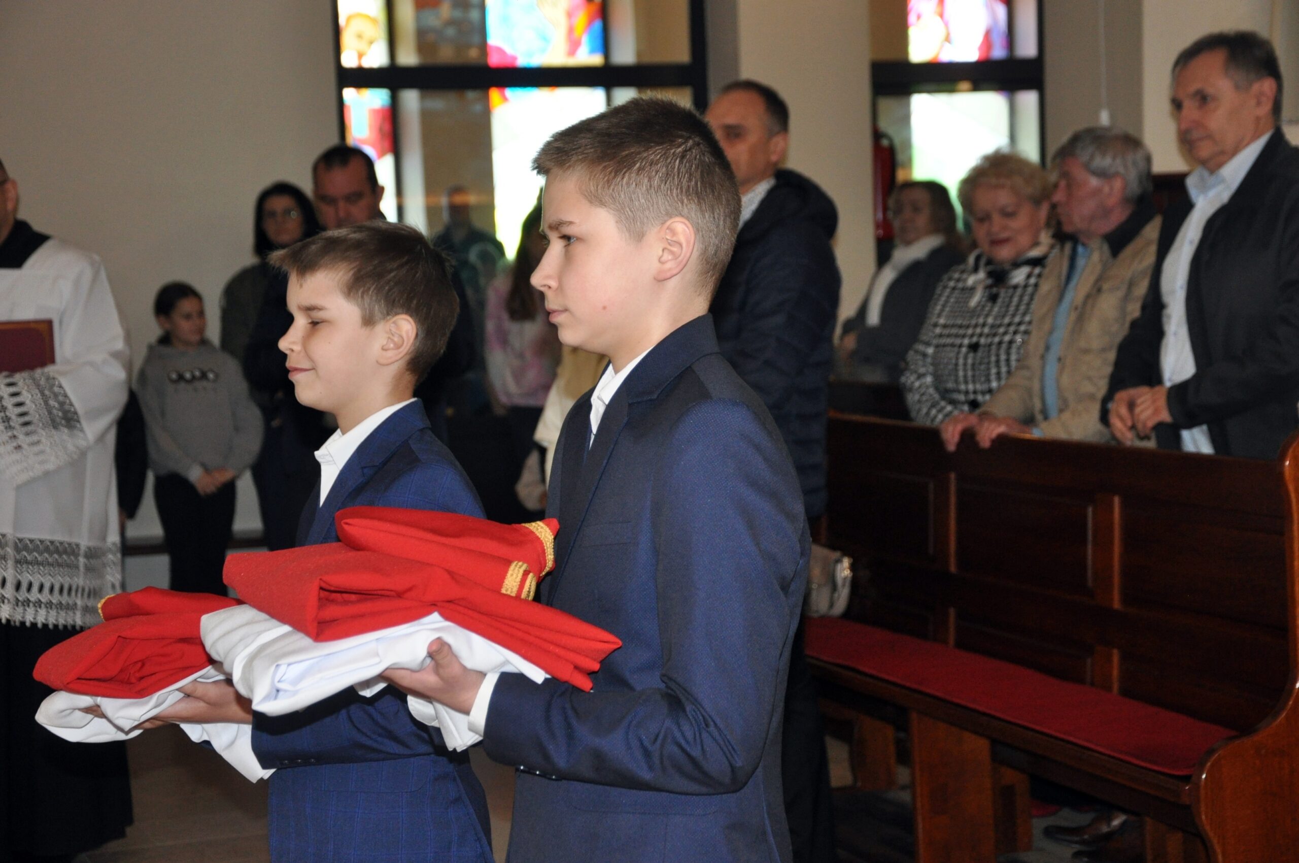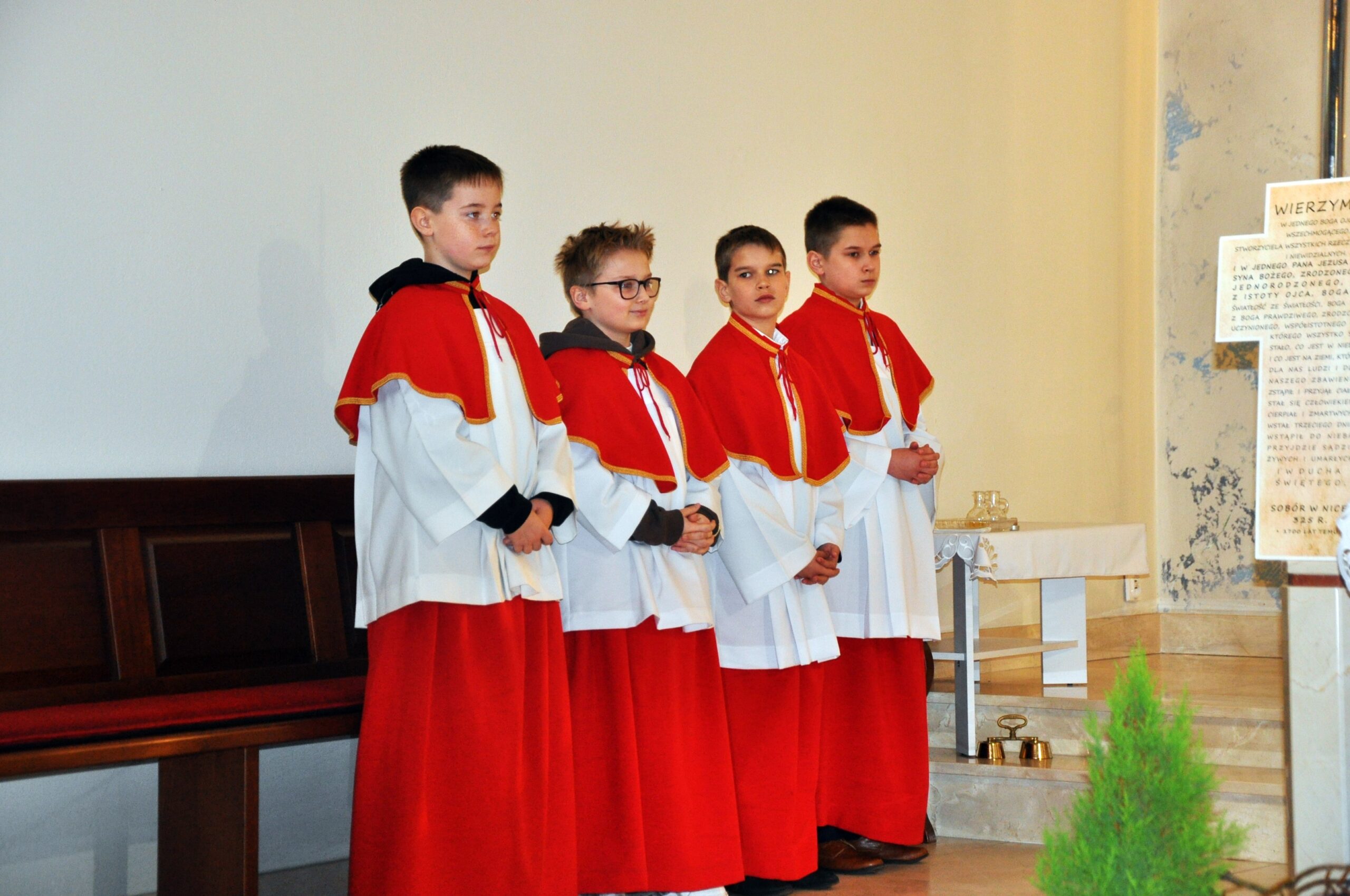 Również 15 marca 2026 roku, w Niedzielę Laetare, z wielką radością nasza wspólnota parafialna powitała w gronie Służby Liturgicznej Ołtarza dwóch nowych ministrantów. Obrzęd przyjęcia miał miejsce podczas Mszy Świętej o godz. 11:30 i dokonał go Ks. Proboszcz. Nowi ministranci, Jakub i Krzysztof, przygotowanie do posługi ministranta rozpoczęli się z nowym rokiem szkolnym 2025/2026. Dziś ich zapał został zwieńczony symbolicznym nałożeniem komży wraz z pelerynką. Rodzice nowym ministrantów ufundowali dla naszej wspólnoty parafialnej dwie nowe pateny ministranckie. Z serca dziękujemy za ten dar ołtarza!